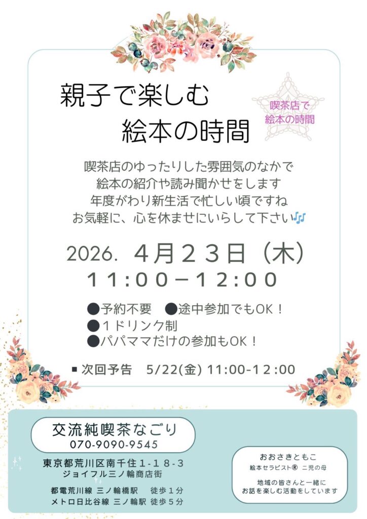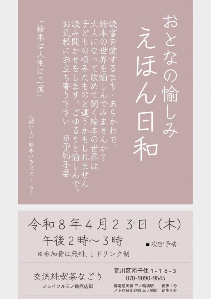 ジョイフル三ノ輪商店街にある「交流純喫茶なごり」にて、4月23日(木)に心温まる2つのイベントが同時開催されます!