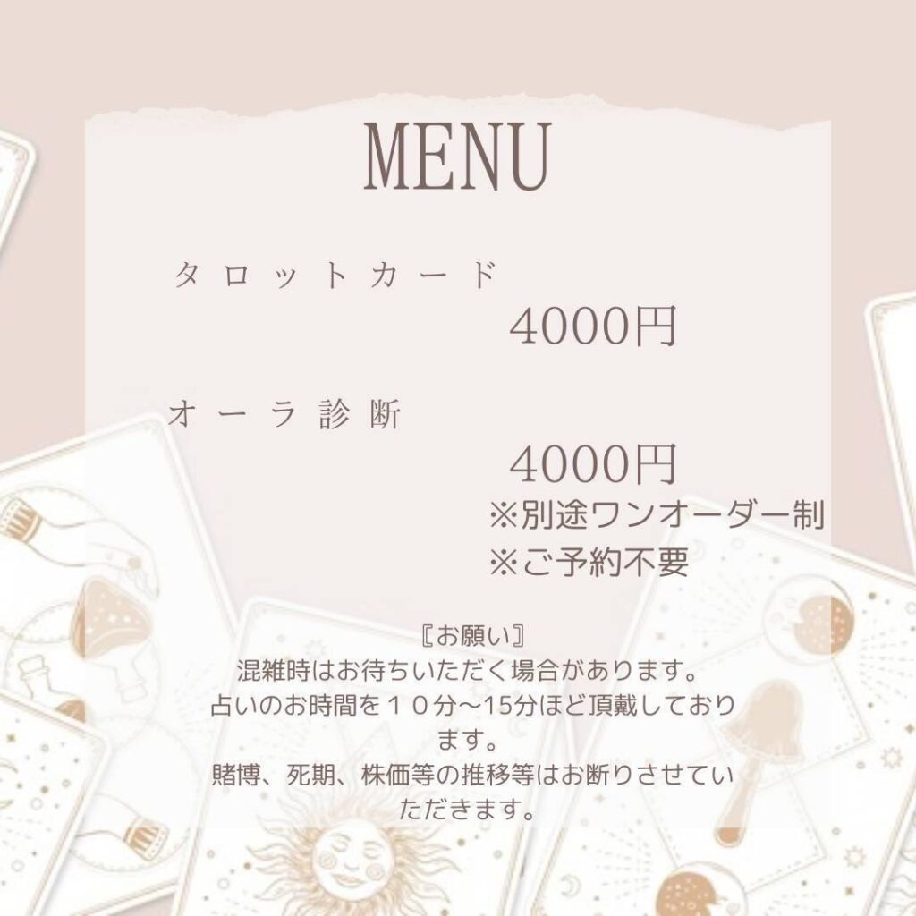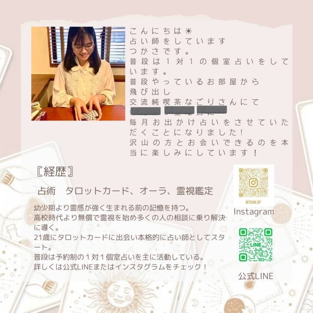 普段は1対1の個室占いをされている占い師の「つかさ」さんが、純喫茶なごりにやってきます!幼少期からの強い霊感を活かし、タロットやオーラ診断であなたの背中をそっと押してくれます。